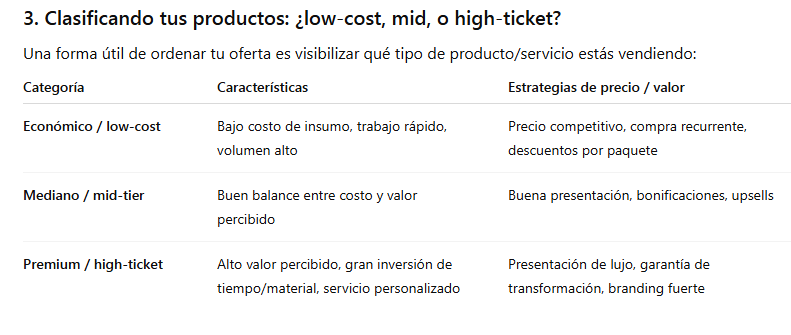 ✨ Tip: Tener productos en al menos dos de estas categorías ayuda a diversificar tus ingresos y atraer diferentes perfiles de clientas.